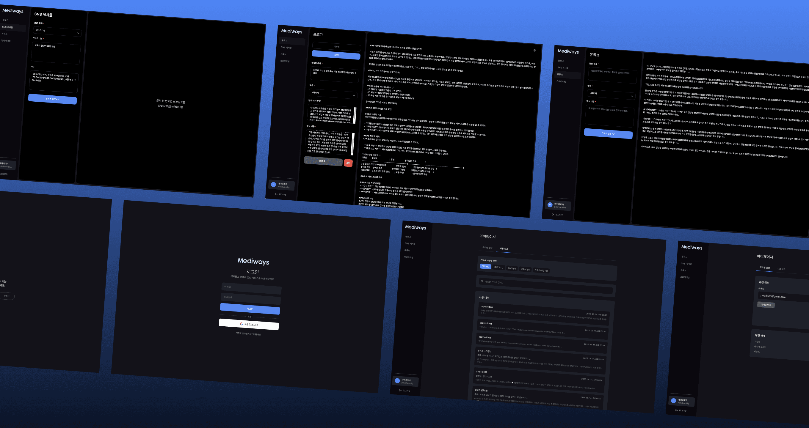 사용자는 구글 아이디만 있다면 간편하게 가입 및 로그인이 가능합니다. 별도의 설정 없이 메디웨이즈는 의료법을 준수하는 광고 콘텐츠를 생성하게끔 세팅되어있어서 간단한 키워드와 내용만 기입하면 의료 광고용 콘텐츠를 유형별로 생성해줍니다. 또한 마이페이지를 통해 기존에 생성했던 콘텐츠를 조회하고 이를 다시 활용할 수 있습니다.